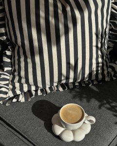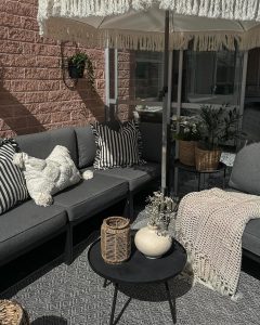 The focal point was the Oxeia 87″ Metal Sofa from the Outdoor Sofas category, which combined comfort and design. I covered it with a Colossal Ribbed Handknit Throw Blanket from the Throws category, to make it cozier. I added the stylish and useful Malibu Metal Stackable Outdoor Side Stool, Set of 2 (18″) from the All Outdoor Lounge Furniture category, for additional sitting. The Classic Striped Outdoor Pillows from the Pillows category offer a flash of color and pattern, while the Caity Indoor Outdoor Washable Floor Mat offers a sturdy yet fashionable base. Lastly, the St. Tropez Beach Umbrella adds a sense of elegance in addition to shade. My outdoor space now has the ideal balance of style and comfort.
